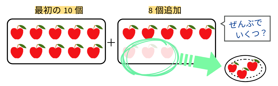 子:「最初に10個のりんごがあって、8個増えたけど、3個食べたんだよね。増えたりんご8個の中から3個食べたんじゃなくて、最初にあった10個から3個食べたのかもしれないよ。」