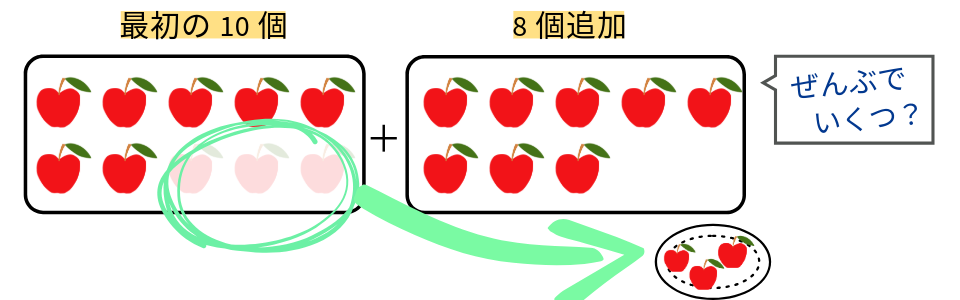 解き方Bが理解しにくいのは、りんごの数を具体的にイメージしているからです。例えば、「8個のりんごから3個を引く」と言われても、最初に10個あったりんごとは別のりんごの数を抽象的に考えるのは子どもにとっては難しいのです。そこで、解き方Bを具体的に理解するために次のように説明できます。